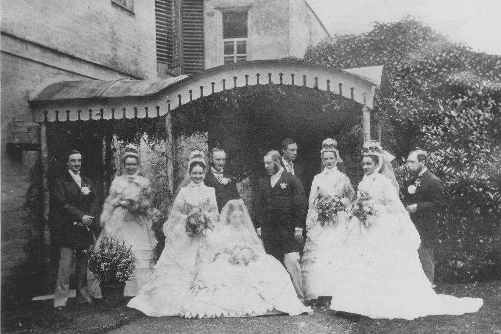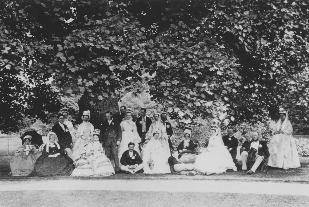 This photo of Ashtead House, which stands in Farm Lane was taken c.1865. Nathanial Smith who had made his fortune in India moved to Ashtead House around 1790 with his wife Hester. He had the house substantially rebuilt around 1800. Their three surviving daughters, who lived in the house with them, remained unmarried. This was believed to be due to opposition from their mother, despite their being suitable suitors. George, their second son married a beautiful young woman called Sarah Hardman who again was not accepted by Hester. The marriage ended in disaster, Sarah leaving George with five young children, who were brought up by his mother and sisters at Ashtead House. The couple’s eldest son, also called Nathaniel, married and had two children. Elizabeth, their daughter married Charles Denshire in 1841, sadly to be widowed 12 years later. In 1859 Elizabeth married the widower The Revd William Denshire, her late husband’s cousin and with the marriage came eight step children six girls and two boys. The family are pictured below outside Ashtead House in 1861.