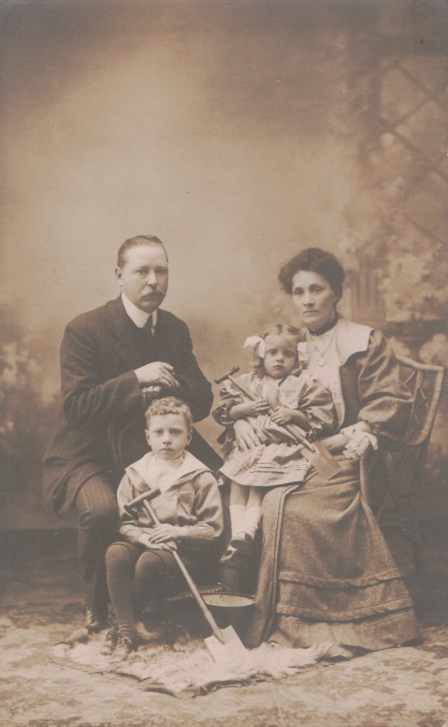 I think this rather serious little family photo, typical of the time, was probably taken on a family holiday as the children are holding spades and there is a bucket on the floor. It has captured one tiny moment in their family life, that has now been preserved in the future.